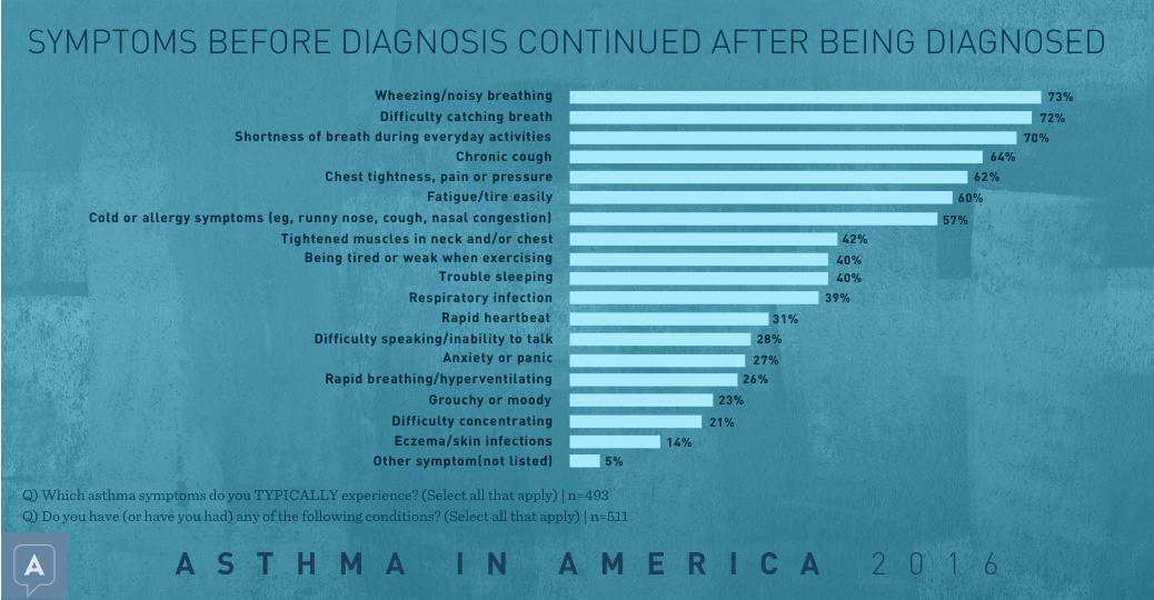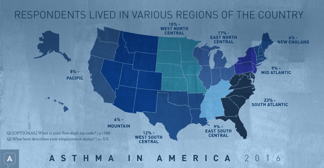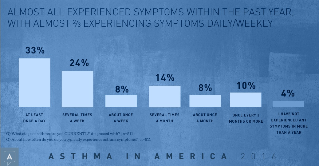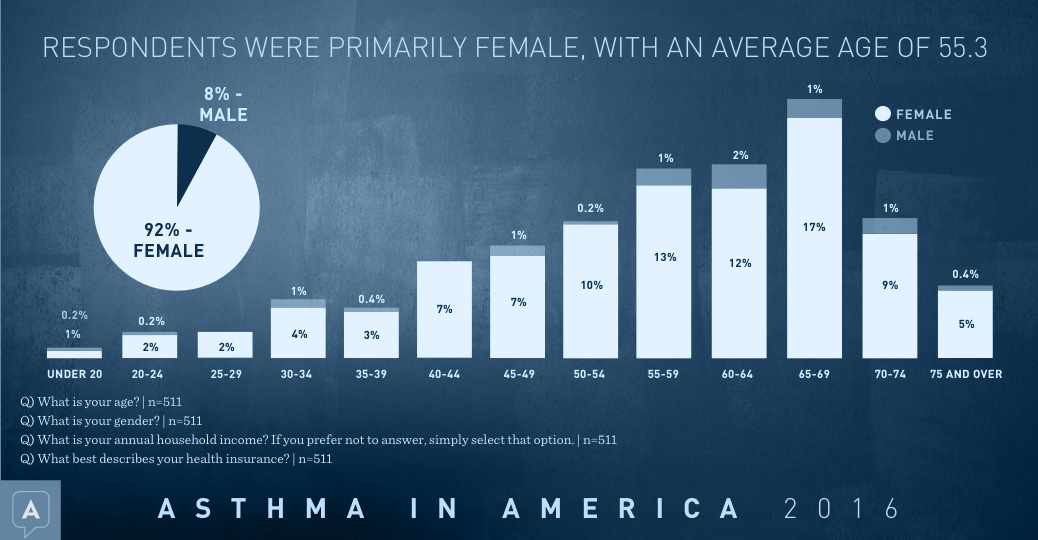 The Asthma In America 2016 online survey was conducted to gather insights from over 500 individuals currently diagnosed with asthma. The primary goal of this research was to better understand the symptoms, treatment, and life impact experienced by those individuals. A survey specific to caregivers of those with Asthma will be presented at a later date.